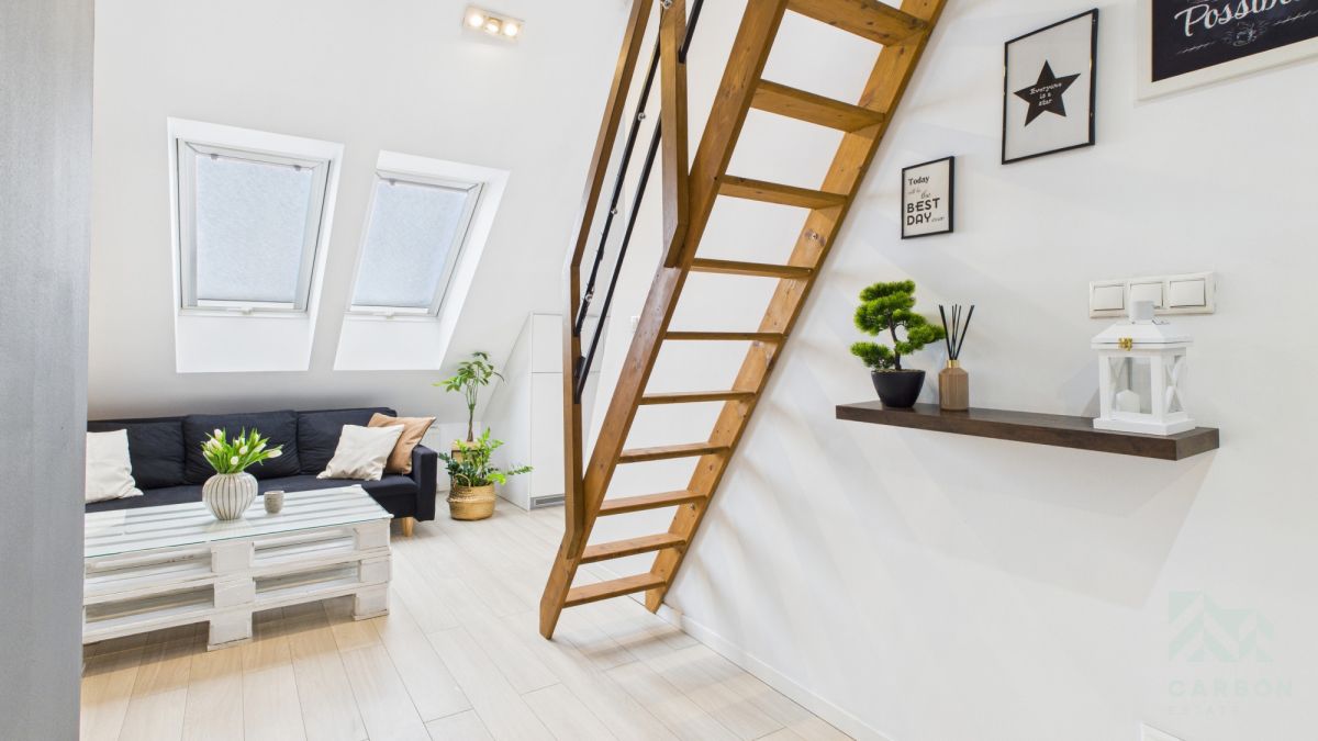 Przestrzeń jest jasna i dobrze doświetlona, a skosy nadają wnętrzu przytulny, niepowtarzalny charakter.