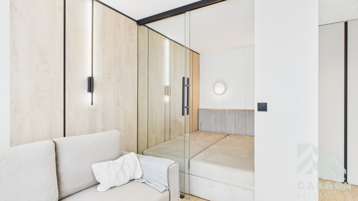 Przemyślany układ 1 pokoju: kuchnia z salonem + wydzielona strefa sypialniana