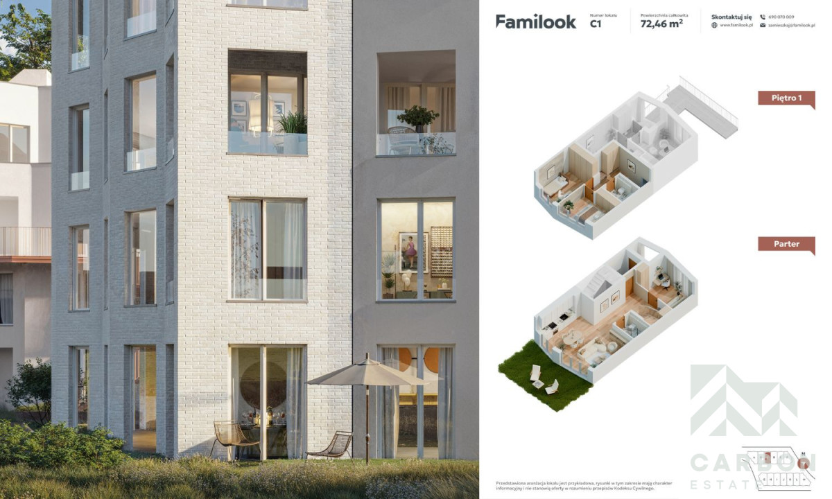 Dwupoziomowe, czteropokojowe pokojowe komfortowe mieszkanie o metrażu 72,46 m2 położone na 1 i 2 kondygnacji w inwestycji deweloperskiej Familook.