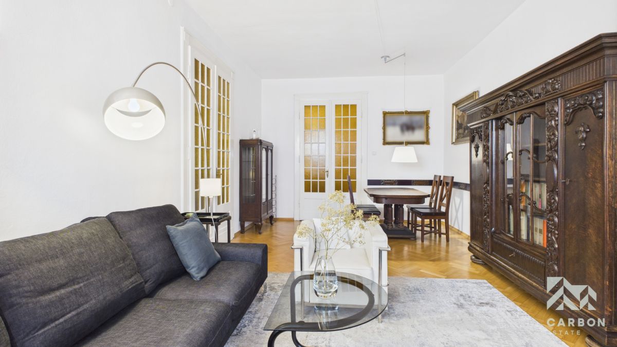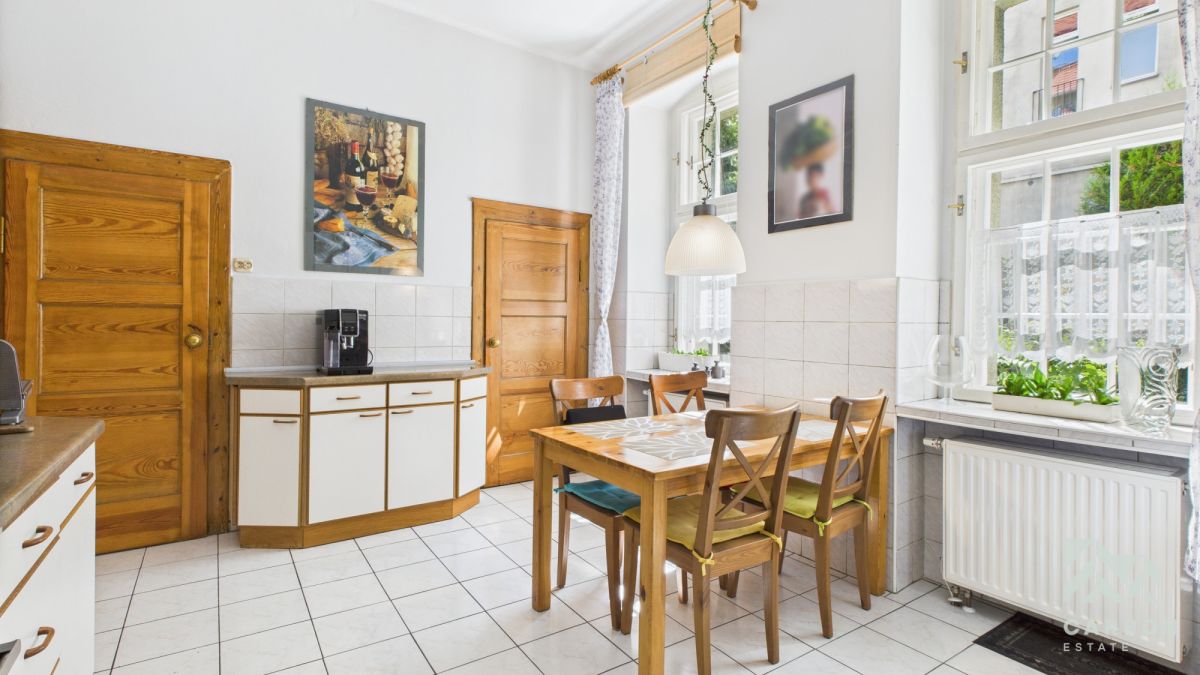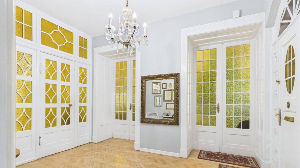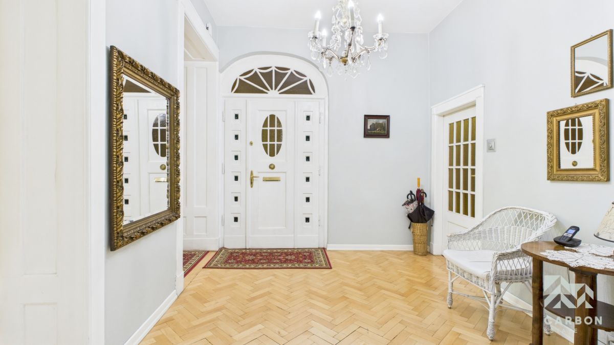 Wnętrza urzekają oryginalnymi, drewnianymi przeszklonymi drzwiami, wysokimi sufitami (ponad 3,2 m), stylowymi meblami oraz klasycznym układem pomieszczeń, który łączy elegancję z funkcjonalnością.